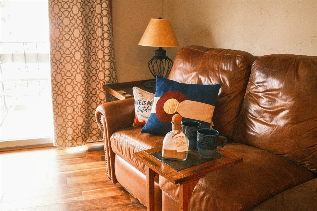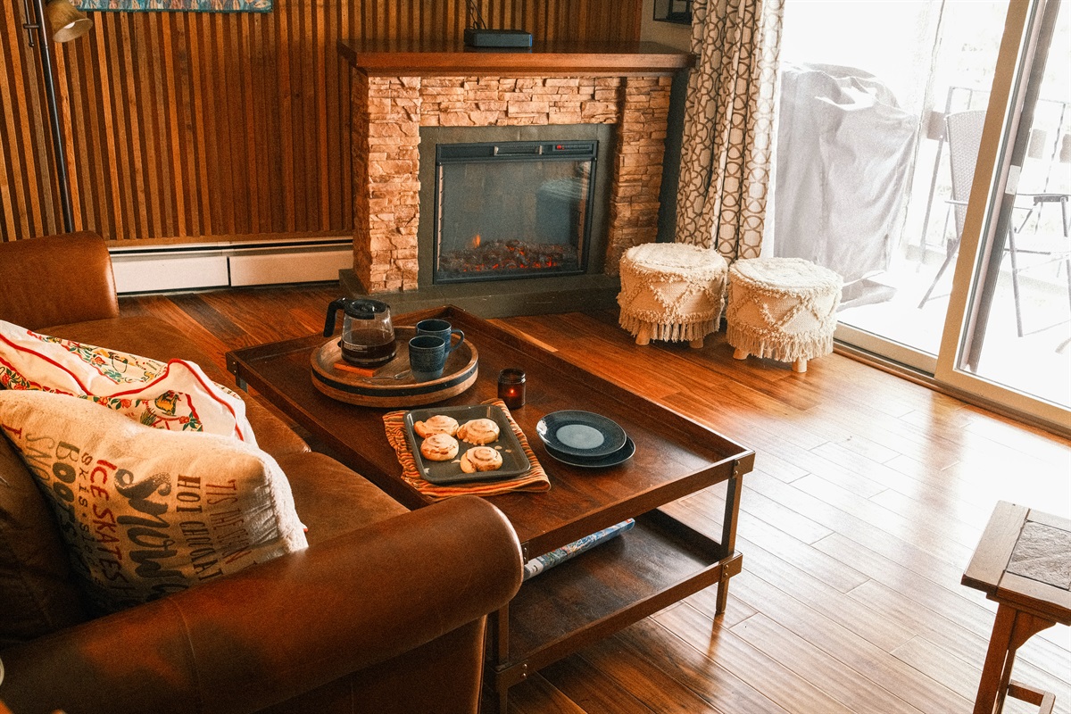 The open-plan living area is framed by soft wooden beams and antique touches. A leather sofa bed and leather sofa with built-in recliners faces an electric fireplace and a tall armoire, holding games and books for a lazy afternoon. Sliding doors lead to a private balcony where you can hear the breeze through the pines and possibly catch a glimpse of the wildlife.