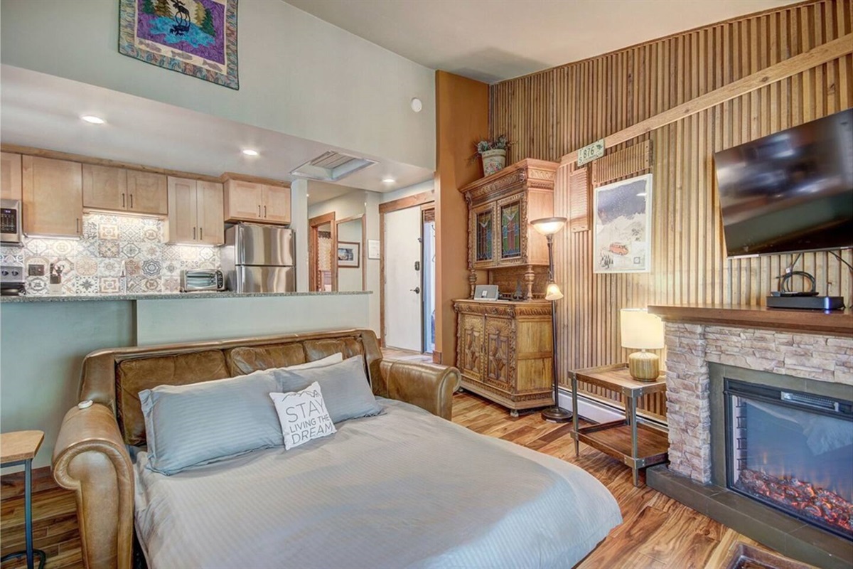 Tucked into the quiet top floor of a small mountain building, this European-inspired condo offers a warm and inviting feeling. Mornings begin with sunlight filtering through tall windows onto the leather recliners and antique armoire. Evenings invite slow dinners on the balcony or a soak in the hot tub just next door. With two queen bedrooms, sofa bed, full kitchen, and a shuttle stop across the road, it’s the perfect place for skiing, hiking, or simply pausing to enjoy the crisp mountain air.